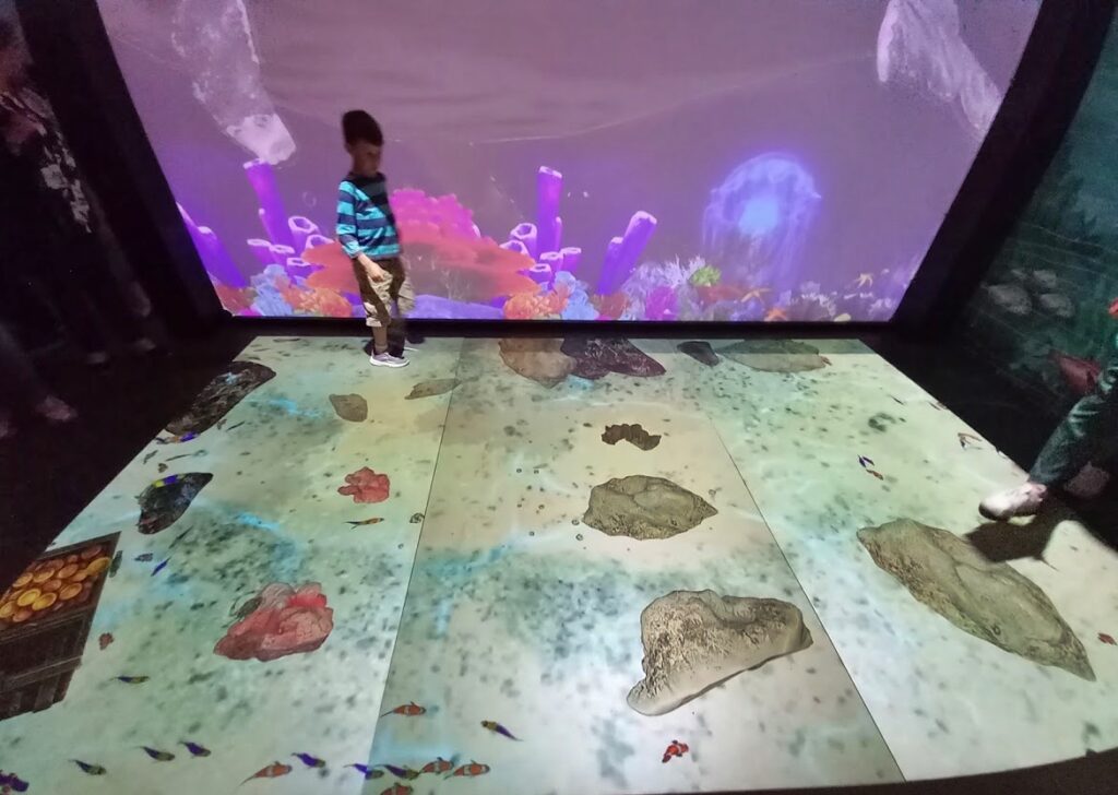 O visitante terá oportunidade de contactar com um aquário virtual, com a projeção em vídeo da vida marinha no fundo do oceano, criando a sensação de que estamos no fundo do mar, com diferentes espécies a reagirem à presença humana. Mas nem tudo é azul. Na caixa mundo, tanto existem praias paradisíacas como áreas marcadas pela ação humana e do lixo, cursos de água poluídos pelo plástico e os animais em risco de vida.