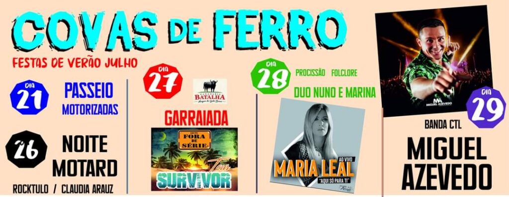 O cartaz das Festas de Verão, destaca ainda outras atividades, como a “Noite Motard” com Rocktulo / Claudia Arauz, no dia 26 e no dia seguinte, uma “Garraiada” e à noite, atuação em palco com os “Fora de Série” e “Survivor”.