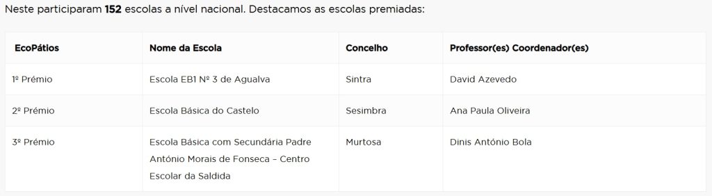 Concorreram 152 escolas a nível nacional, que foram desafiadas a criar um projeto para o todo ou uma parte do espaço exterior da escola, dentro daquilo que cada instituição participante pretende que seja o “Pátio ideal”, em que as premissas mencionadas sejam respeitadas.