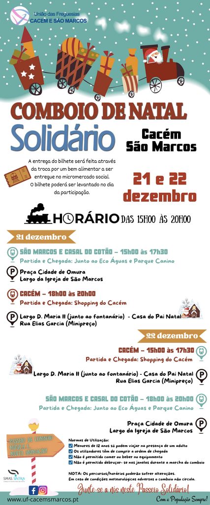Uma vez mais o “Comboio de Natal Solidário”, vai estar nas Escolas e nas Instituições da União das Freguesias do Cacém e São Marcos, de 16 a 22 de dezembro.