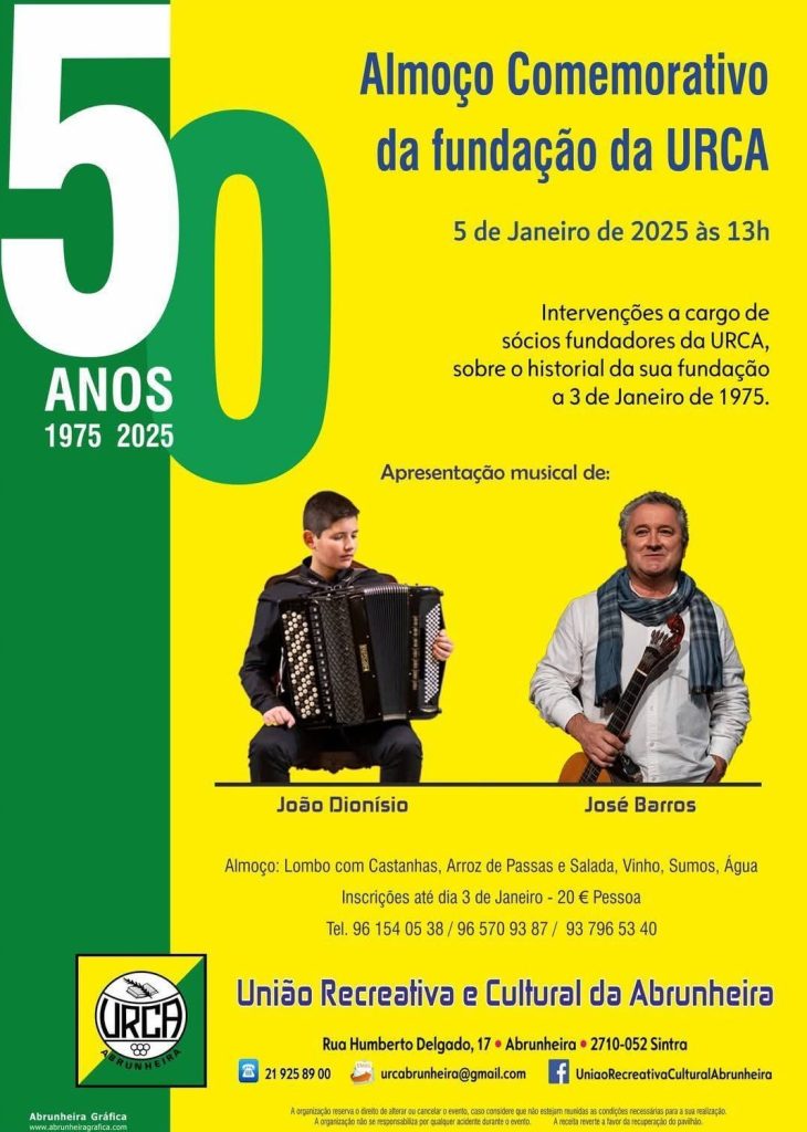 A União Recreativa Cultural da Abrunheira (URCA) assinala os 50 anos da sua fundação, com um almoço Comemorativo, no dia 5 de janeiro, a partir das 13h00 e durante a tarde.
