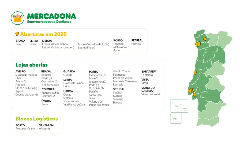 A Mercadona vai abrir, em 2025, 10 novos supermercados em Portugal para dar continuidade ao seu plano de expansão. Até ao momento, a Mercadona já conta com 60 lojas abertas e dois Blocos Logísticos a funcionar na Póvoa de Varzim e em Almeirim. Com estas aberturas, vai terminar o ano com 70 lojas em território nacional.