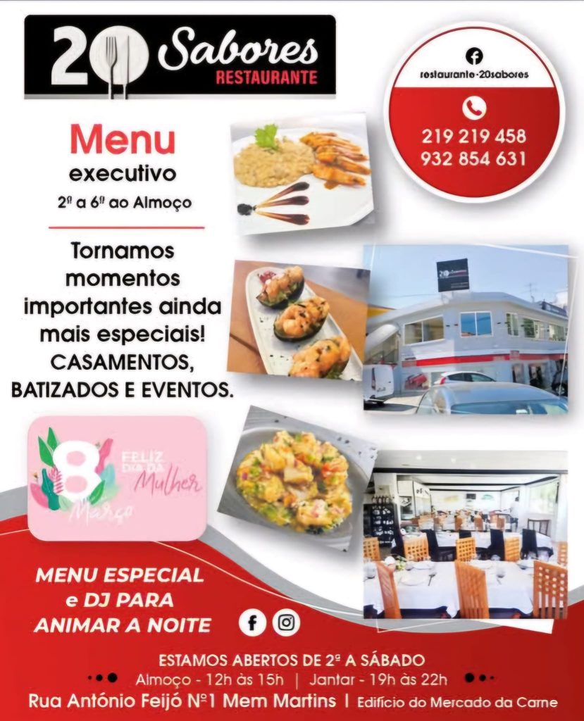 O restaurante “20 sabores” promove ao longo do ano vários eventos, como vai acontecer no próximo Dia Internacional da Mulher e organiza também festas de casamento, dispondo de uma equipa pronta para dar resposta as esses momentos especiais.