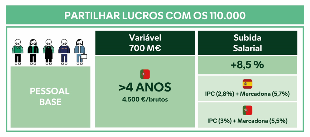 Para reconhecer o esforço, compromisso e exemplo de uma equipa de alto desempenho que nunca se põe limites, a Mercadona aumentou o salário em 8,5 %, mais de 5 pontos percentuais acima do IPC de Portugal e de Espanha, além de partilhar uma remuneração variável por objetivos (prémio), relacionada com lucros da empresa, de 700 milhões de euros.