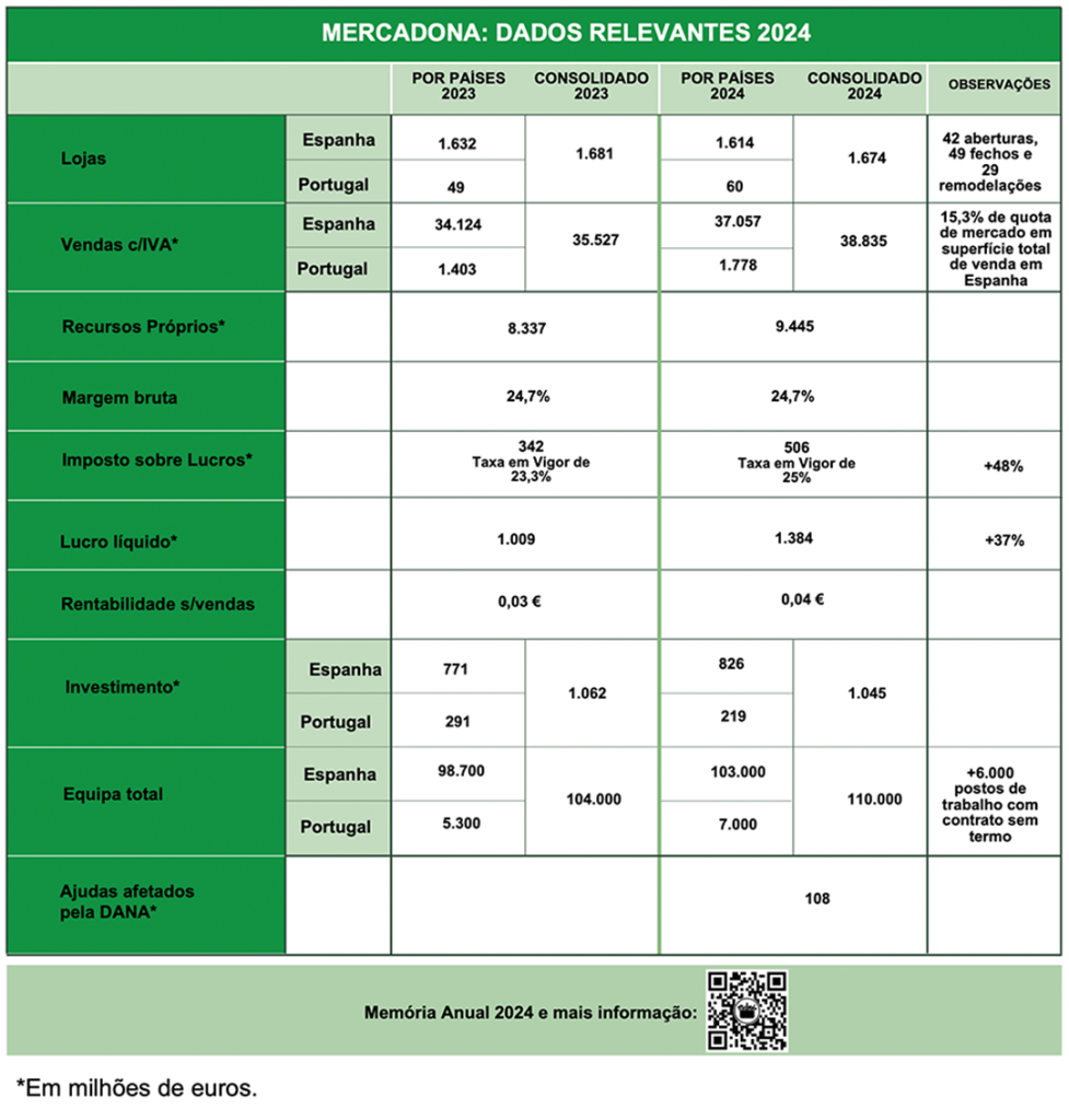 Em 2024, a Mercadona realizou um investimento total de 219 milhões de euros em Portugal, atingiu um volume de vendas de 1.778 milhões de euros, mais 27% do que no ano anterior, e contribuiu com 237 milhões de euros em impostos através da empresa portuguesa Irmãdona Supermercados, com sede em Vila Nova de Gaia (Porto).