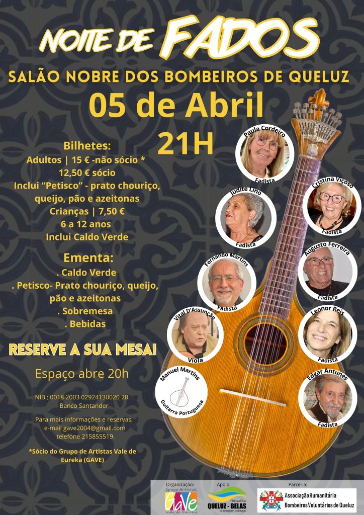 O GAVE – Grupo de Artistas Vale Eureka organiza, no dia 5 de abril, às 21h00, uma Noite de Fado, que terá lugar noSalão Nobre dos Bombeiros Voluntários de Queluz.