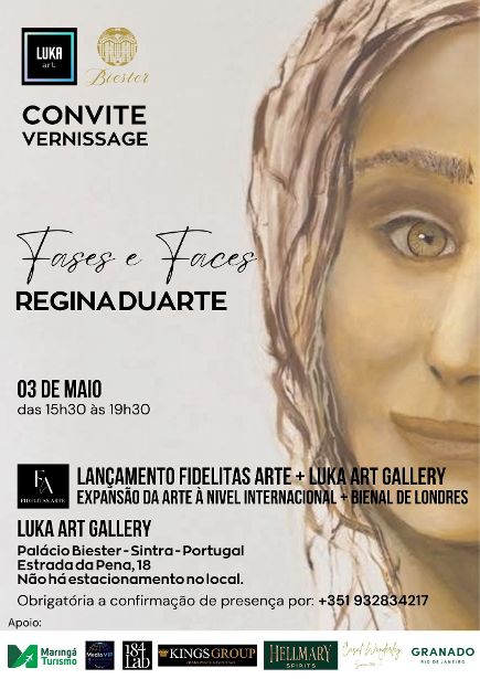 A Luka Art Gallery, situada no Palácio Biester, revela em comunicado que Regina Duarte vai estar presente para inaugurar a exposição “Fases e Faces”, onde serão apresentadas pinturas feitas ao longo de mais de 40 anos, “nos bastidores da sua própria vida. A arte sobrepõe-se às censuras, ideologias e divisões de opiniões e prova, nesta exposição, a verdadeira essência de respeito e reconhecimento de uma artista”, lê-se na nota de imprensa.