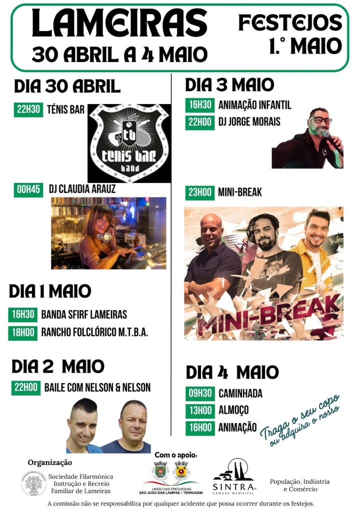 Os festejos arrancam esta quarta-feira, dia 30 de abril com as atuações de Ténis Bar (22h30) e a DJ Claúdia Arauz (00h45). No feriado nacional, 1 de maio, conte com a atuação em palco da Banda da SFRF de Lameiras (16h30) e o Rancho Folclórico MTBA (18h00).