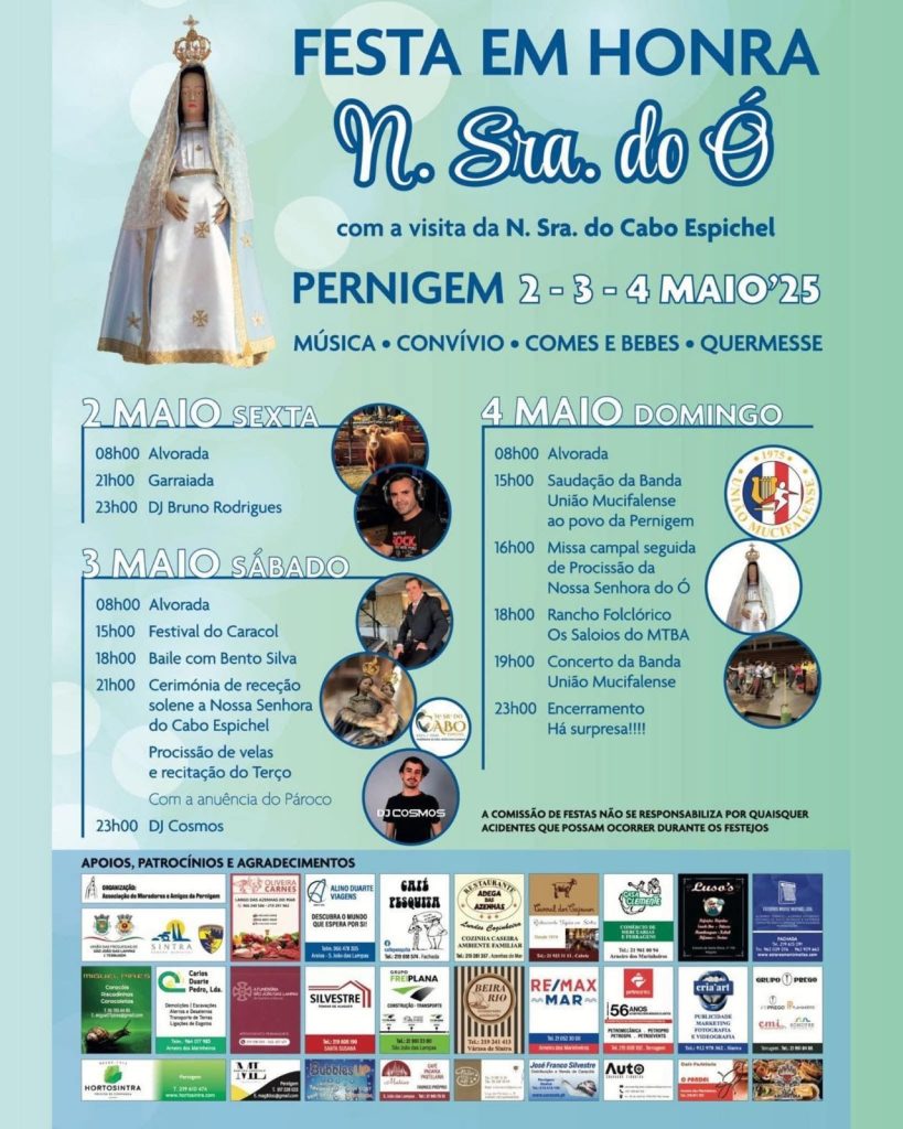 A localidade da Pernigem acolhe a Festa em Honra de Nossa Senhora do Ó, nos dias 2, 3 e 4 de maio, por ocasião da visita da imagem de Nossa Senhora do Cabo Espichel. Serão três dias de fé, música, convívio, gastronomia e tradição, com quermesse, animação e muita alegria.