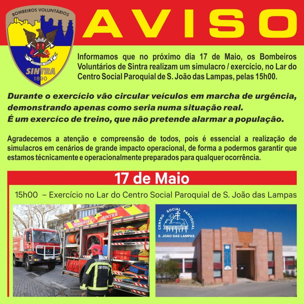 Os Bombeiros Voluntários de Sintra vão realizar no próximo dia 17 de maio, um simulacro/exercício, que terá lugar no Lar do Centro Social e Paroquial de São João das Lampas, pelas 15 horas.