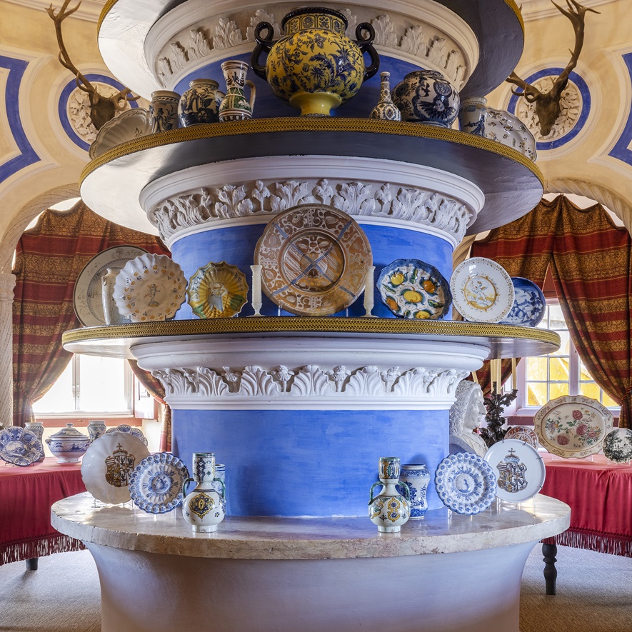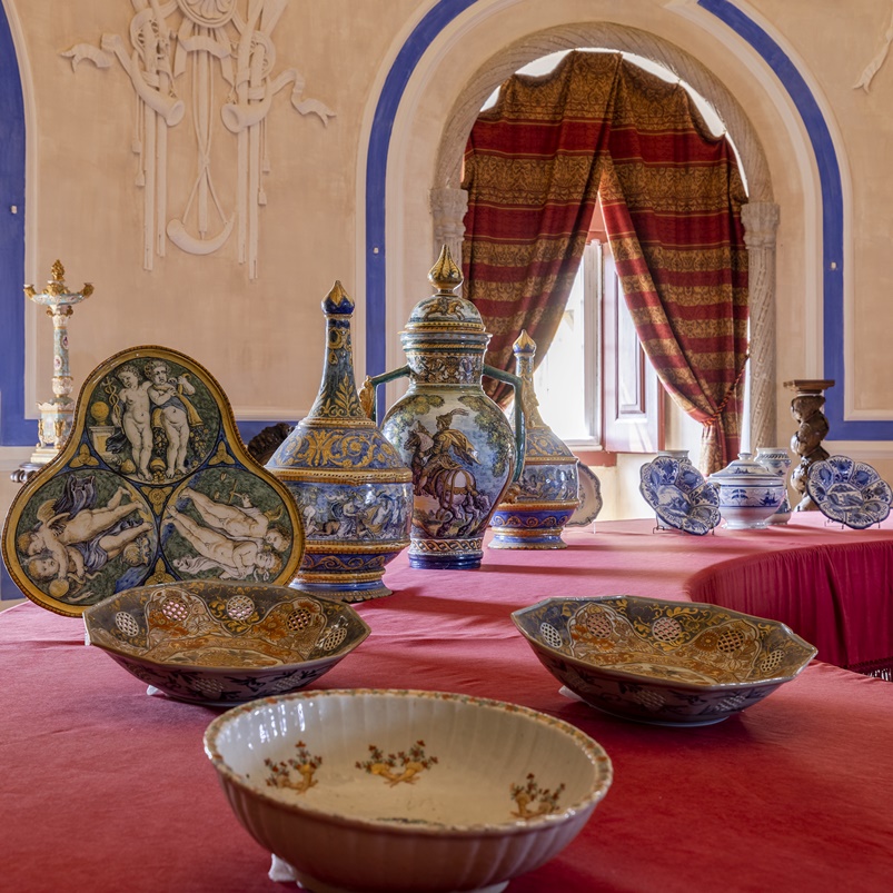 Entre pratos, jarras, potes, peanhas, candelabros e tamboretes, a maioria das peças expostas são em faiança, de diversas épocas e proveniências. D. Fernando II, o Rei-Artista, era um apaixonado pelas artes e um ávido colecionador que reuniu um extenso e variado conjunto de obras de grande qualidade. A Sala dos Veados mostra uma parte dessa coleção e permite entender o gosto do rei, não apenas no que à cerâmica dizia respeito. A decoração do espaço merece, igualmente, uma atenção especial.