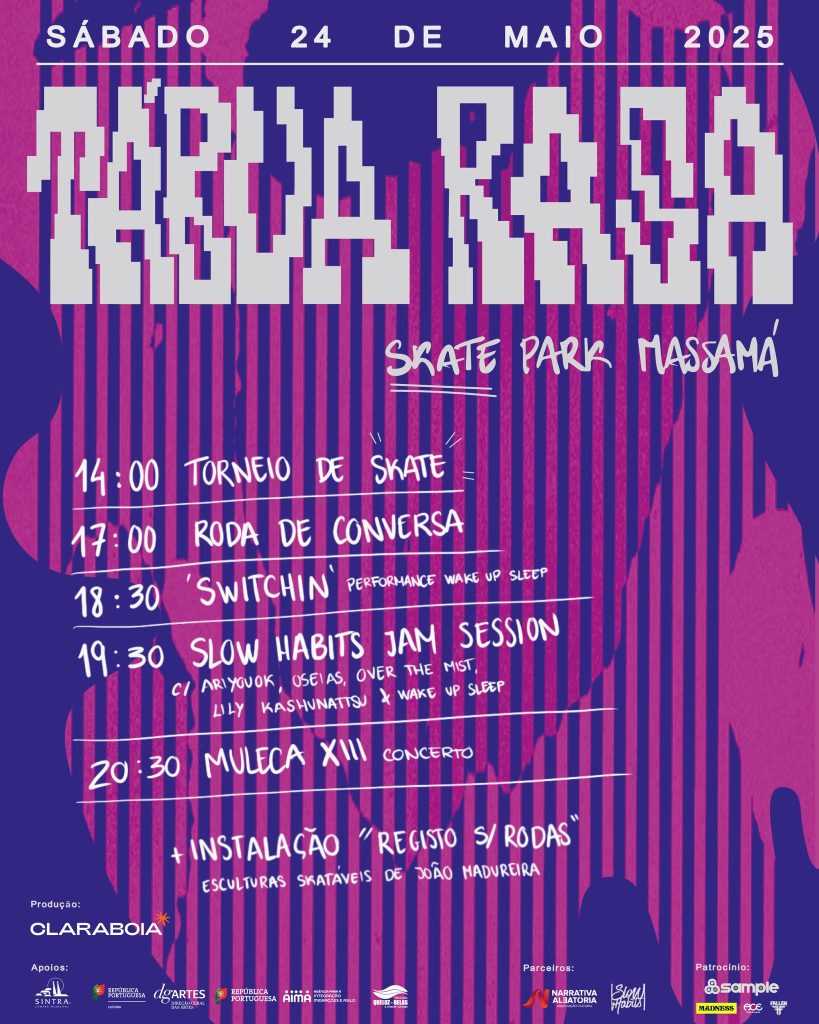 No próximo dia 24 de maio, o Skatepark de Massamá vai ser palco do Tábua Rasa, evento de celebração do skate, da música, e da ocupação criativa e coletiva do espaço público, organizado pela Claraboia em parceria com a Narrativa Aleatória e Slow Habits.