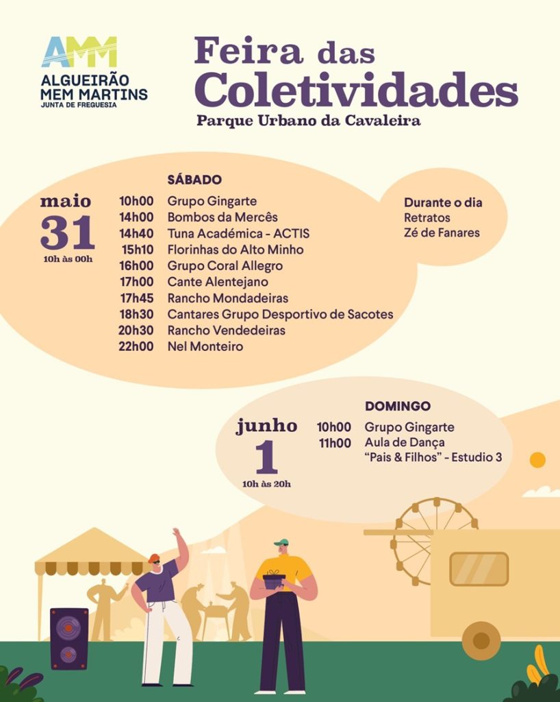 A Junta de Freguesia de Algueirão Mem Martins, organiza nos dias 31 de maio e 1 de junho, mais uma edição da Feira das Coletividades, com atividades, animação e insufláveis, evento que terá lugar no Parque Urbano da Cavaleira, no Algueirão.
