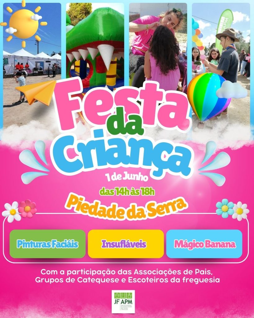 A União das Freguesias de Almargem do Bispo, Montelavar e Pêro Pinheiro promove no domingo, 1 de junho, das 14h00 às 18h00, mais uma “Festa da Criança”, na localidade da Piedade da Serra.