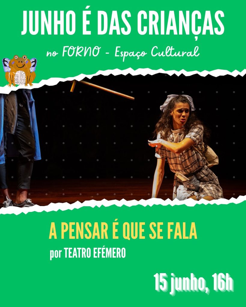 No dia 15 de junho, pelas 16h, é a vez do Teatro Efémero subir a palco para apresentar “A pensar é que se fala”. “Alice, uma jovem aventureira, fala-nos sobre a história de duas crianças que perderam a capacidade de falar, sendo banidas para uma floresta. Porque deixaram de falar? Porque foram banidas?” É o que se vai descobrir no dia 15 de junho no Forno.
