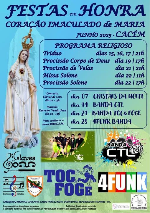 A Paróquia do Cacém celebra as Festas em Honra do Coração Imaculado de Maria nos dias 15, 16, 17, 19, 21 e 22 de junho. O bar foi remodelado e está pronto para servir petiscos, febras e sardinhas assadas em ambiente de grande festa e animação.