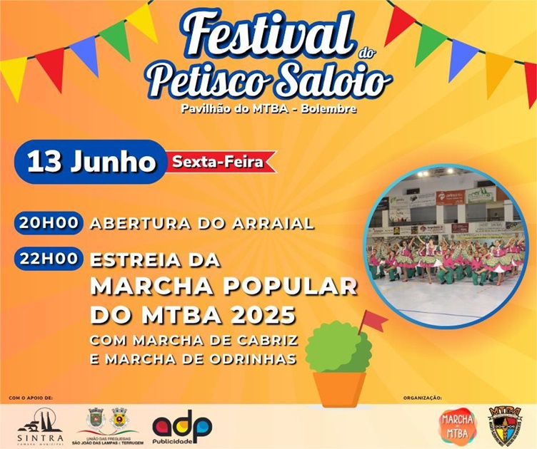 O Pavilhão MTBA, em Bolembre, volta a ser palco da tradicional Marcha Popular e do Festival do Petisco Saloio, nos dias 13, 20 e 28 de junho.