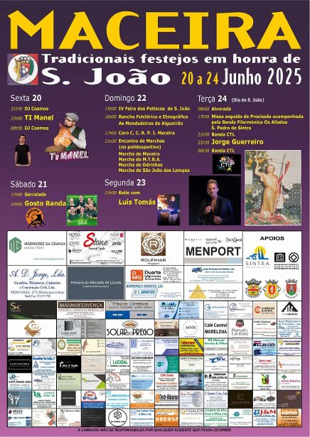 O programa é vasto e conta com bailes, marchas populares, atuação de dj’s, uma garraiada noturna (13) e os comes e bebes tradicionais dos santos populares.  Destaque ainda para a Exposição de Automóveis Club Golf III (14) e para a atuação das Marchas Populares (15) de Maceira, MTBA, Cabriz e São João das Lampas.