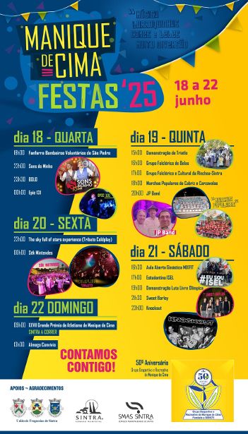 Manique de Cima está em festa, entre os dias 18 e 22 de junho, com muita música, barraquinhas, comes e bebes e muita diversão numa edição que marca o 50º aniversário do Grupo Desportivo e Recreativo de Manique de Cima.