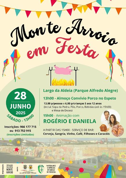 Está de regresso no próximo dia 28 de junho atradicional Festa Anual da Aldeia de Monte Arroio. A partir das 13h o Largo da Aldeia (Parque Alfredo Alegre) será palco de uma festa animada e repleta de sabores tradicionais, organizada pela População da Aldeia Monte Arroio.