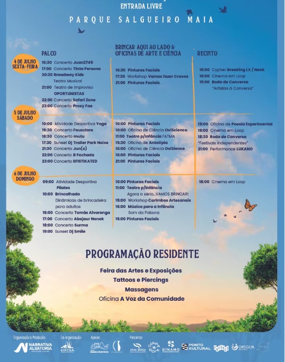 O cartaz musical inclui nomes como B Fachada, Surmaee, Tinta Persona, Fauxclore, Sfistikated, Mutu, Jun(o) e DJ Trailer Park Noise. A programação estende-se também ao teatro, dança, exposições, cinema em loop, artesanato e gastronomia de rua.