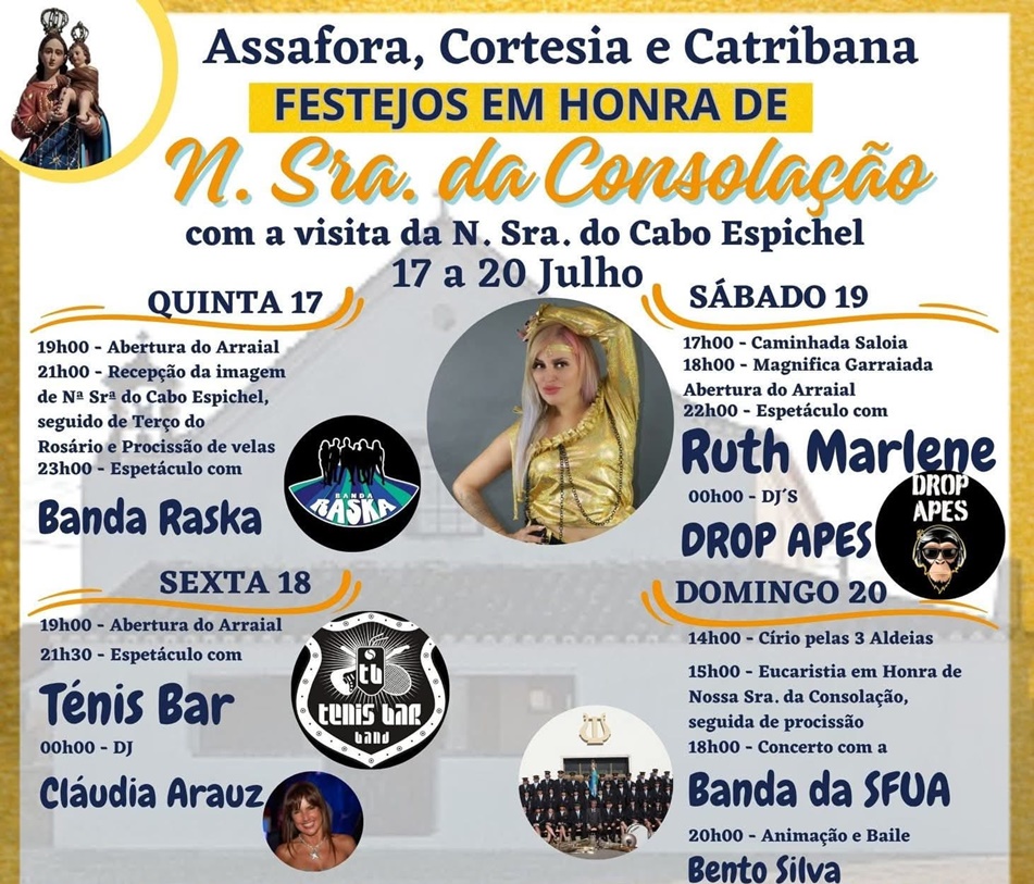 Entre os dias 17 e 20 de julho, as localidades de Assafora, Cortesia e Catribana celebram os tradicionais festejos em honra de Nossa Senhora da Consolação, com a visita da imagem da N. Sra. do Cabo Espichel. As comemorações prometem momentos de fé, convívio e muita animação, juntando a comunidade e visitantes em torno da tradição.
