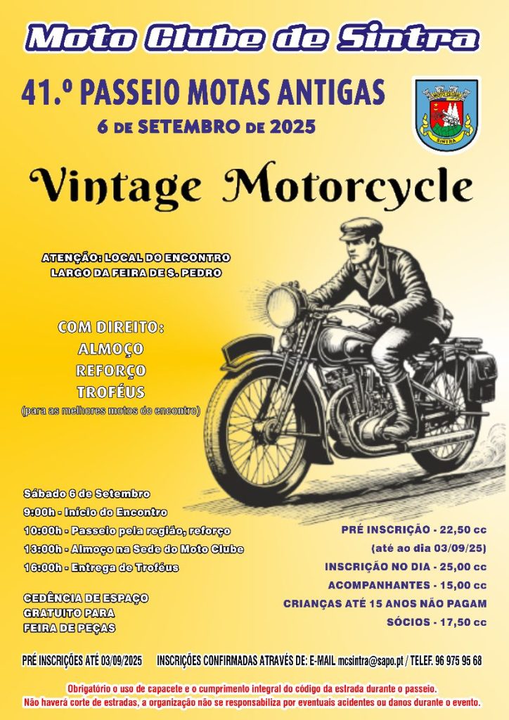 No próximo dia 6 de setembro de 2025, o Moto Clube de Sintra volta a celebrar a paixão pelas duas rodas com a realização do 41.º Passeio de Motas Antigas – Vintage Motorcycle. O evento, que já é uma tradição na região, promete reunir entusiastas e colecionadores para um dia de convívio, história e nostalgia.
