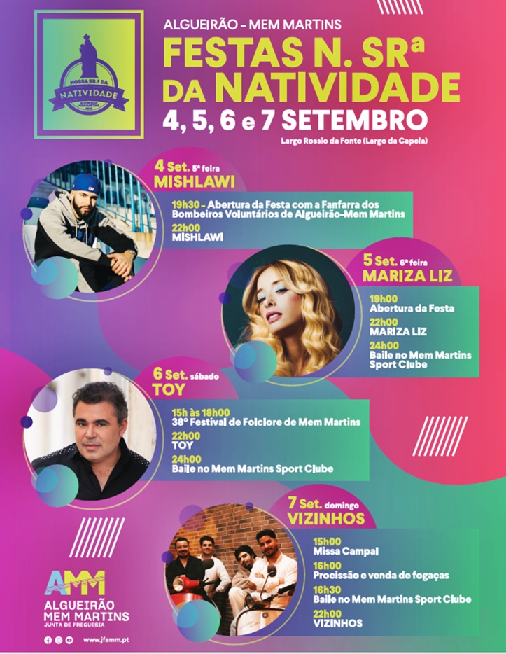 O Largo Rossio da Fonte, em Algueirão-Mem Martins, volta a ser palco das tradicionais Festas de Nossa Senhora da Natividade, de 4 a 7 de setembro, com concertos, folclore, dança e atividades religiosas. Conte ainda com artesanato, gastronomia e não deixe de visitar os stands das associações e instituições que apresentam diferentes projetos desenvolvidos na freguesia.