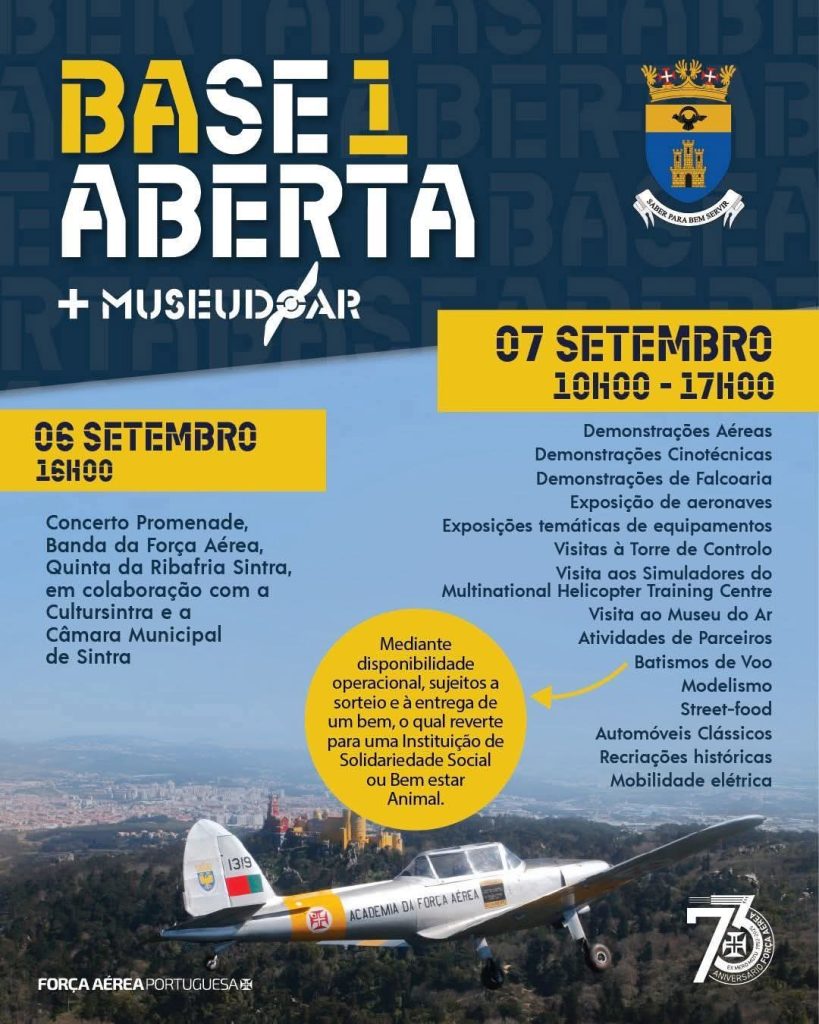 No domingo, 7 de setembro, entre as 10h00 e as 17h00, a Base Aérea N.º 1, em Sintra, abre as suas portas para a comunidade com a iniciativa “Dia de Base Aberta”, com acesso livre.