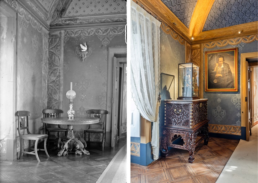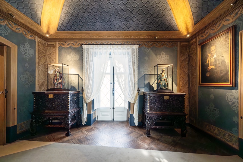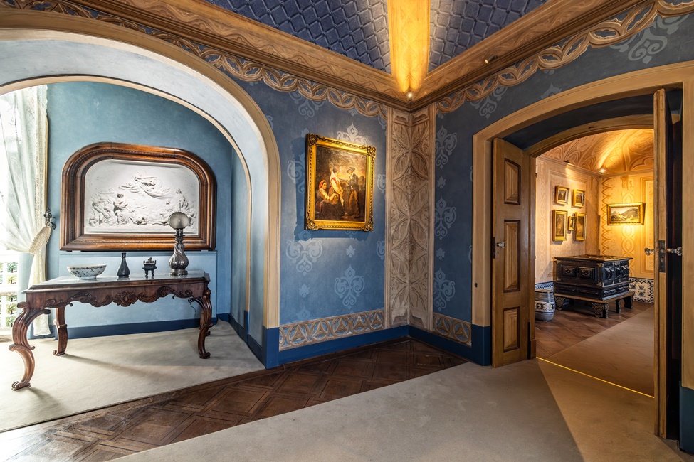 Na Primeira Sala regressaram móveis portugueses escolhidos pelo Rei-Artista, como um contador, uma arca e um armário neogótico, além de peças de cerâmica europeia. Já a Segunda Sala recupera o exotismo pretendido por D. Fernando II, com arcas indianas, esculturas chinesas e um raro perfumador de grés negro. Para completar a reconstituição, foram introduzidas cortinas de renda produzidas em tear histórico, em consonância com os inventários da época.