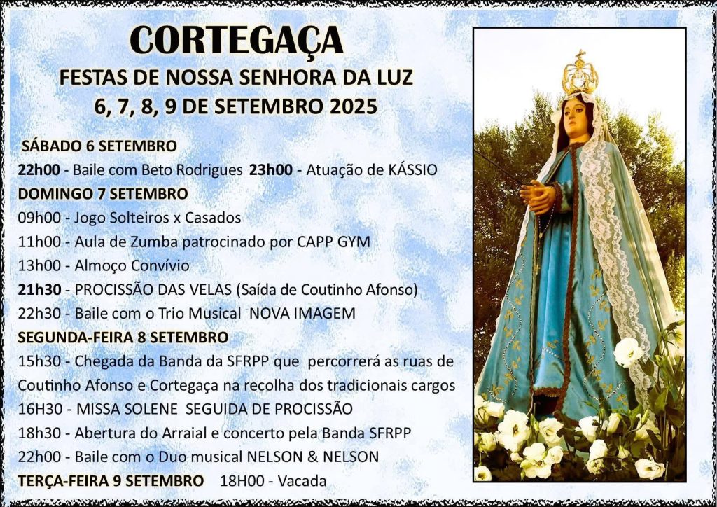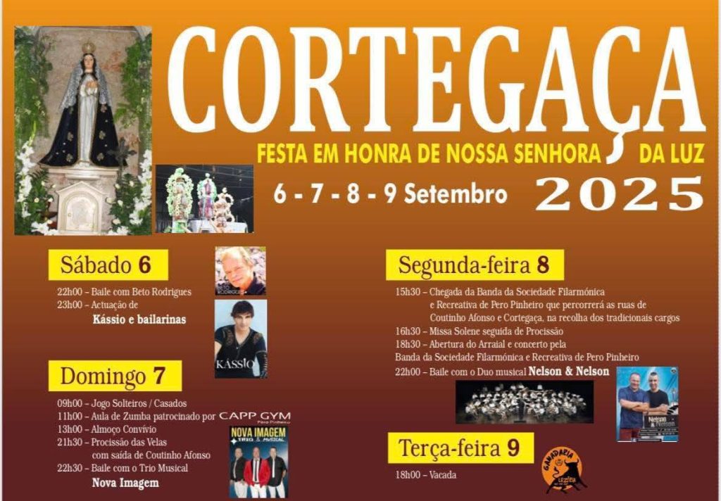 A localidade de Cortegaça, recebe entre 6 e 9 de setembro de 2025, a tradicional Festa em Honra de Nossa Senhora da Luz, um dos momentos mais aguardados da comunidade local, que combina devoção religiosa, música e convívio popular.