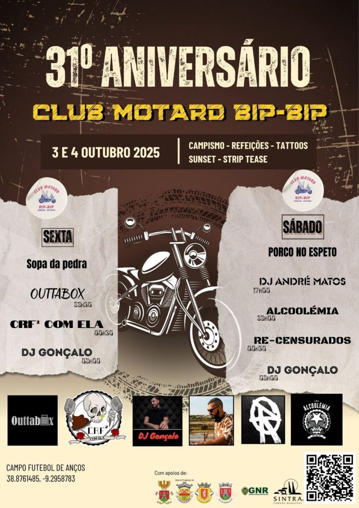 O Club Motard Bip-Bip assinala o seu 31.º aniversário nos dias 3 e 4 de outubro de 2025, no Campo de Futebol de Anços, em Montelavar, com um programa repleto de música, gastronomia e animação.