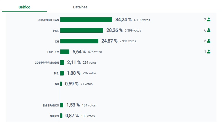 Carlos Fernandes do CHEGA obteve 24,87% dos votos seguido de Filipe Borregana da CDU, com 5,64%.