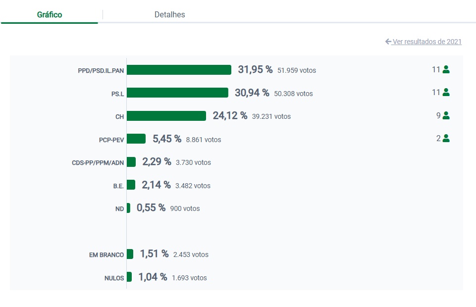 A terceira força política mais votada foi o CHEGA, com 24,12% dos votos e nove mandatos, liderado por Luís Fernandes. A CDU, com Ana Maria Alves como cabeça de lista, alcançou 5,45%, elegendo dois representantes.