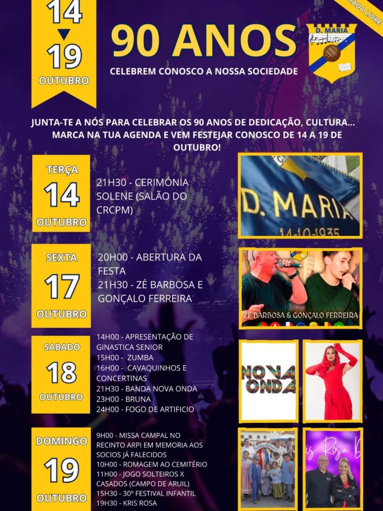A Sociedade Recreativa e Cultural D. Maria celebra, entre 14 e 19 de outubro, nove décadas de história dedicadas à cultura, à música e à comunidade local. O programa das comemorações promete seis dias repletos de atividades, espetáculos e momentos de convívio.
