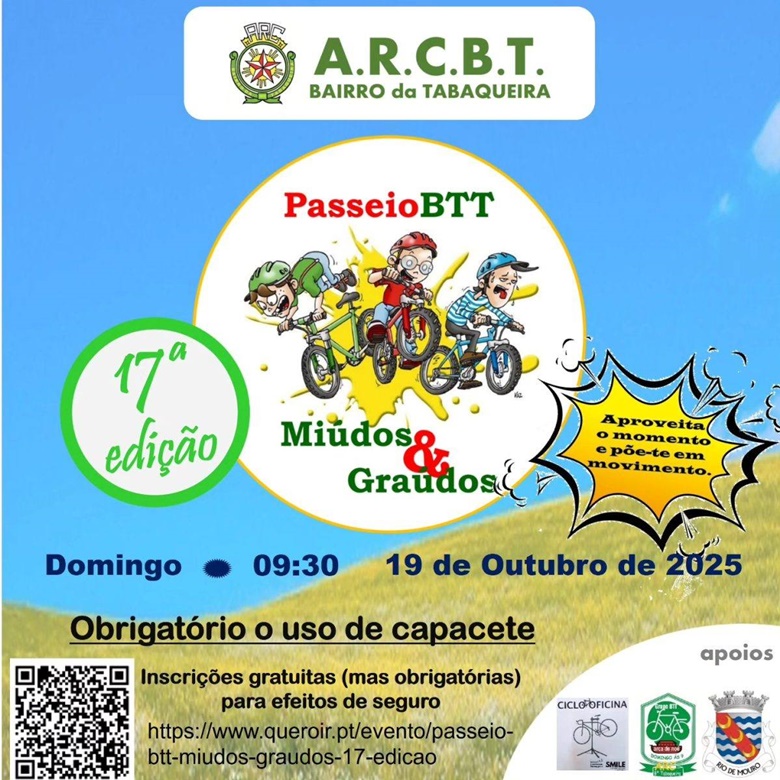 A Associação Recreativa e Cultural do Bairro da Tabaqueira (ARCBT) na Freguesia de Rio de Mouro, promove mais uma edição do tradicional Passeio BTT “Miúdos & Graúdos”, marcada para domingo, dia 19 de outubro, às 09h30.