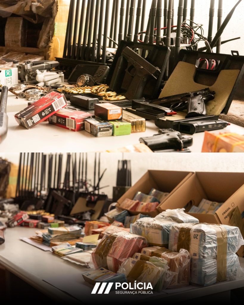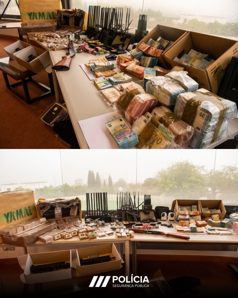 Entre o material apreendido contam-se, além do estupefaciente, avaliado em vários milhões de euros, 580 mil euros em numerário, dez viaturas, 21 telemóveis, duas metralhadoras, cinco pistolas, uma caçadeira, um revólver, três armas elétricas, cerca de 500 munições, duas lanchas rápidas, seis embarcações, 21 motores de alta potência, seis relógios de luxo e 15 mil litros de gasolina, entre outros equipamentos, incluindo sistemas de CCTV, painéis solares e inibidores de comunicações.
