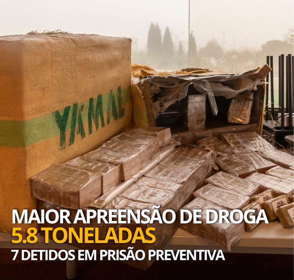 A Polícia de Segurança Pública (PSP) apreendeu cerca de 5.800 quilos de haxixe, “a maior quantidade de droga apreendida pela PSP, com um valor estimado no mercado ilícito superior a vários milhões de euros”, no decorrer de uma operação de grande envergadura contra o tráfico de droga na Grande Lisboa, realizada entre 17 e 20 de outubro.