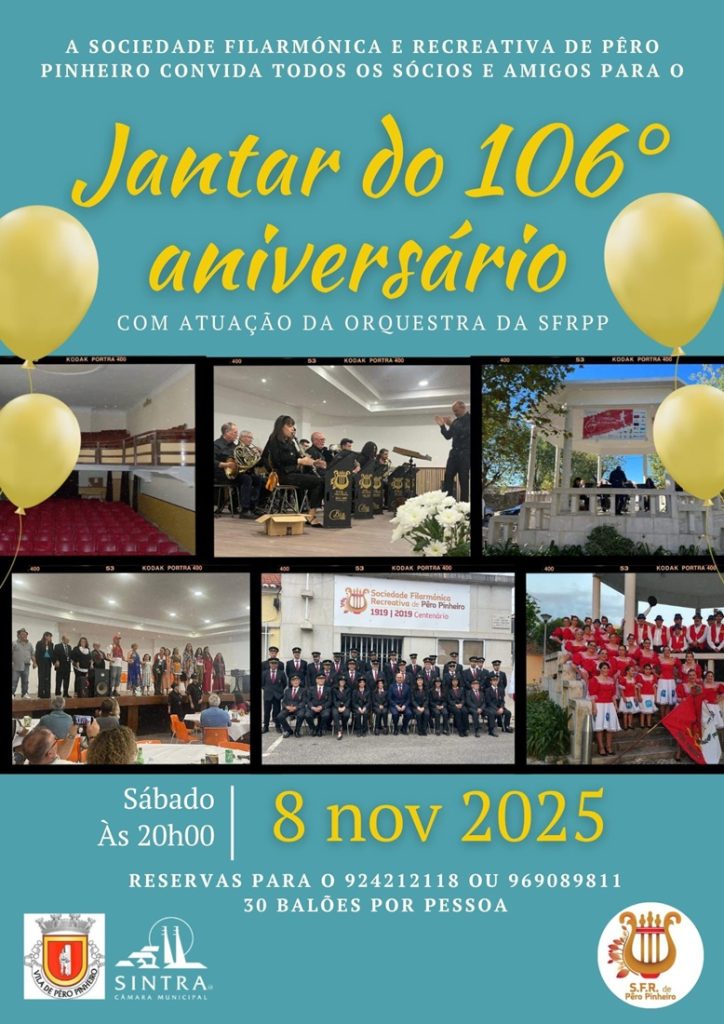 A Sociedade Filarmónica e Recreativa de Pêro Pinheiro (SFRPP) comemora o seu 106.º aniversário com um jantar festivo seguido de concerto, no próximo dia 8 de novembro, a partir das 20h00.