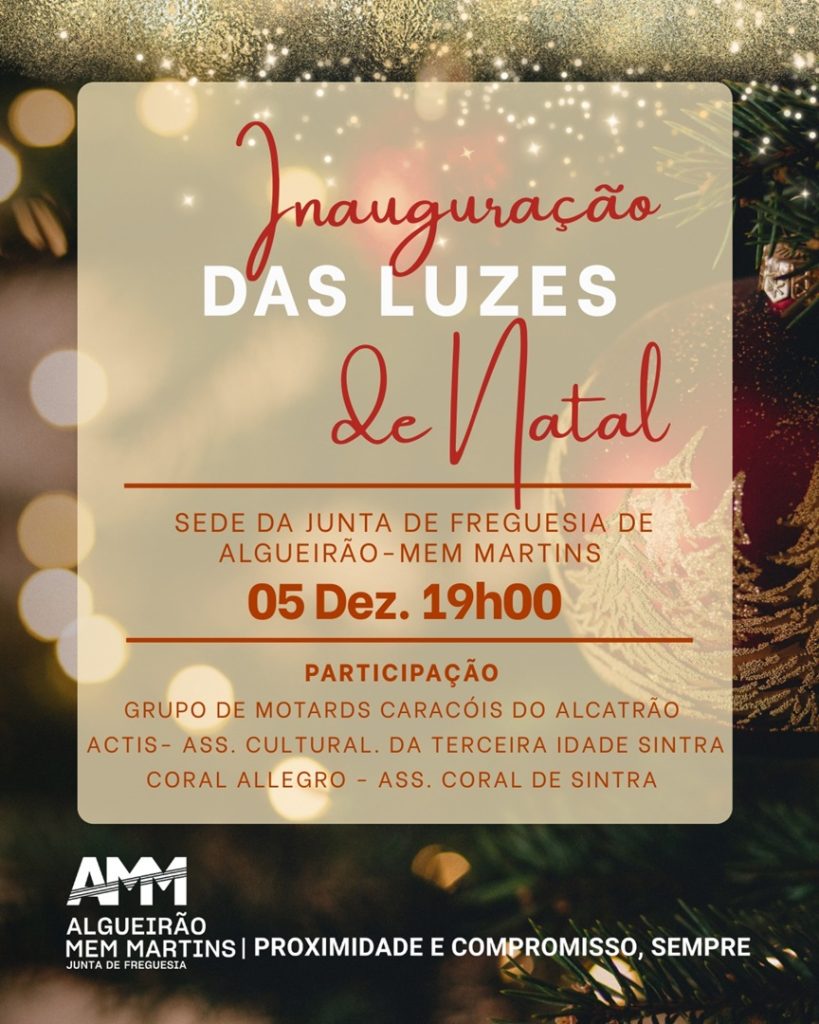 A Junta de Freguesia de Algueirão-Mem Martins inaugura nesta sexta-feira, 5 de dezembro, às 19h00, a iluminação de Natal, nas suas instalações na Estrada da Mem Martins, nº 222.