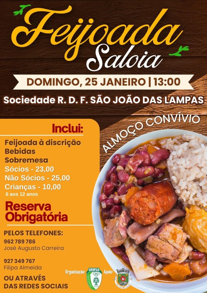 A Sociedade Recreativa, Desportiva e Filarmónica (SRDF) de São João das Lampas promove, no próximo domingo, 25 de janeiro, a partir das 13h00, um almoço-convívio dedicado à tradicional feijoada saloia.