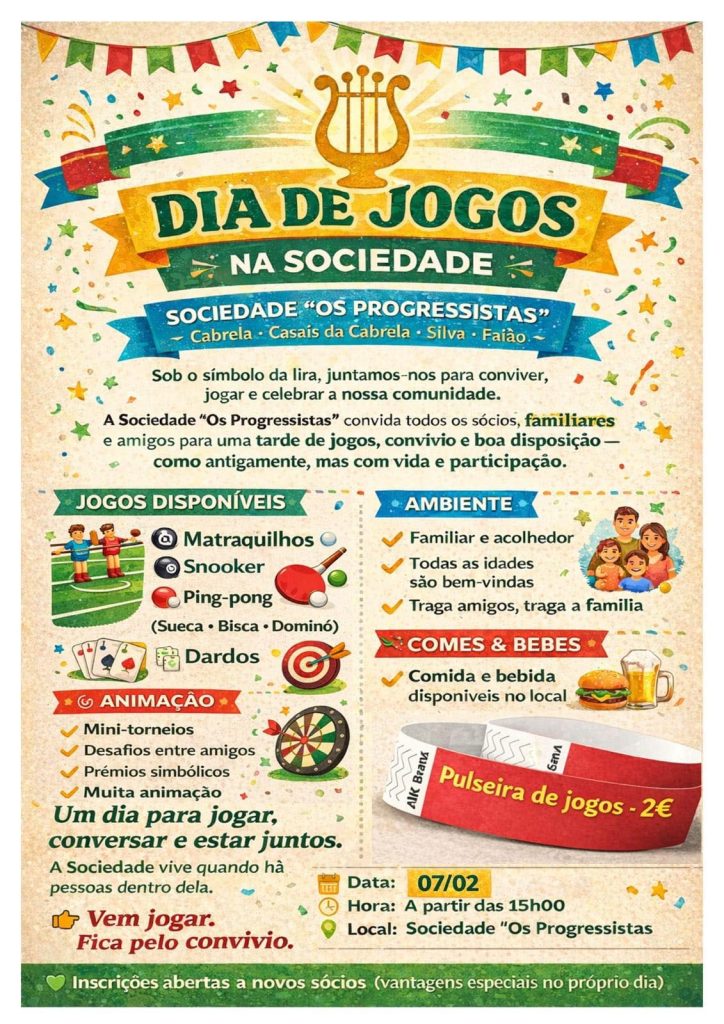 A Sociedade Recreativa “Os Progressistas”, sediada em Cabrela (Terrugem), promove no próximo dia 7 de fevereiro o Dia de Jogos na Sociedade, uma iniciativa que pretende reforçar o convívio comunitário e valorizar as tradições recreativas locais.