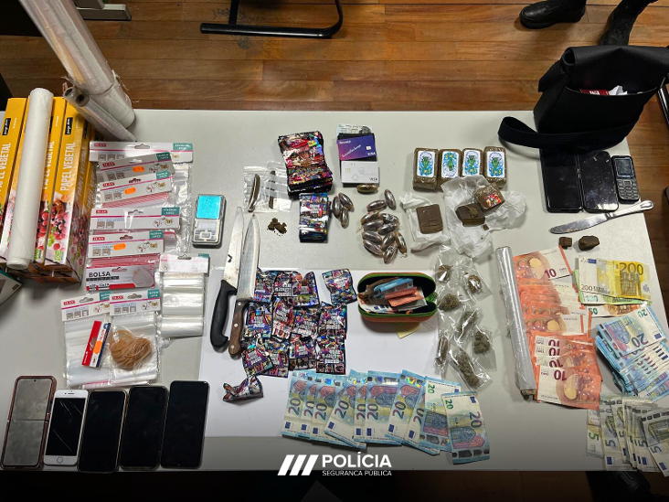 Da operação resultou a apreensão de 1583,20 doses individuais de haxixe, 7,51 doses de liamba, oito telemóveis, três facas alegadamente utilizadas para o corte do produto, uma balança de precisão, 1.445 euros em numerário e diverso material de embalagem, incluindo películas aderentes, papel vegetal e bolsas herméticas destinadas ao acondicionamento e distribuição.