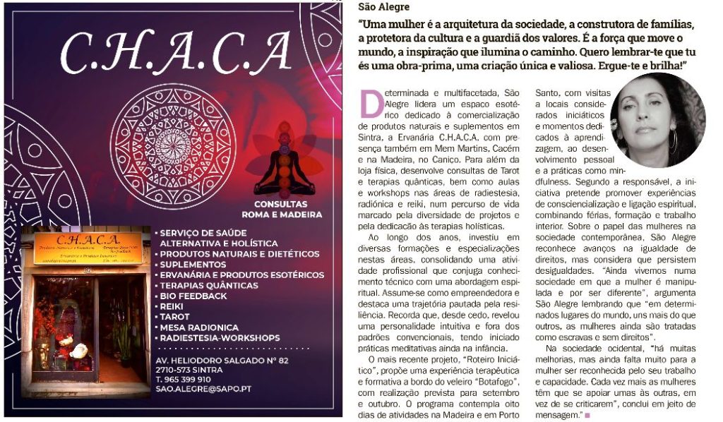 Determinada e multifacetada, São Alegre lidera um espaço esotérico dedicado à comercialização de produtos naturais e suplementos em Sintra, a Ervanária C.H.A.C.A, com presença também em Mem Martins, Cacém e na Madeira, no Caniço.