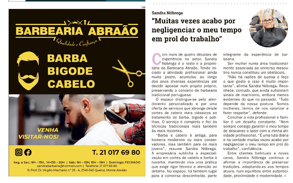 Com mais de quatro décadas de experiência no setor, Sandra Nóbrega é o rosto e a proprietária da Barbearia Abraão. Tendo iniciado a atividade profissional ainda muito jovem, acumulou ao longo dos anos diversas experiências até decidir apostar num projeto próprio, preservando o conceito de barbearia tradicional portuguesa.