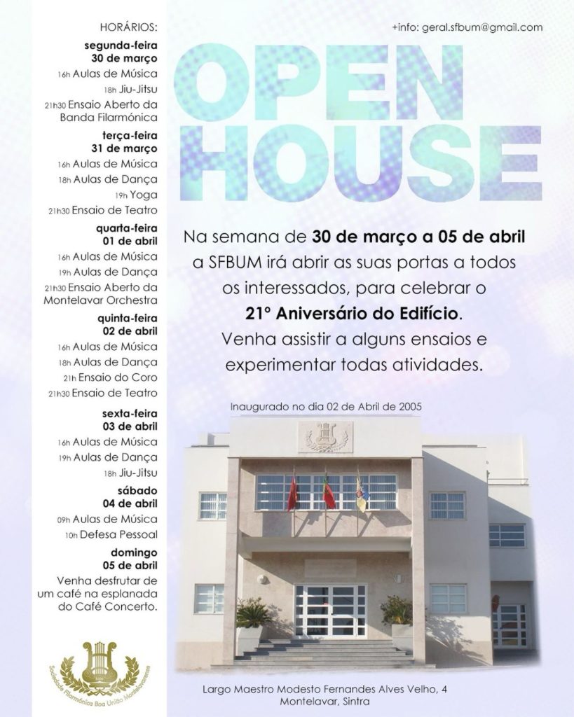 A Sociedade Filarmónica Boa União Montelavarense (SFBUM) promove, entre os dias 30 de março e 5 de abril, uma semana de “Portas Abertas” para assinalar o 21.º aniversário do seu edifício sede.