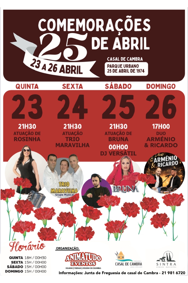 A freguesia de Casal de Cambra, assinala os 52 anos de Revolução de 25 de abril, no Parque de Urbano “25 de abril de 1974” com um programa de quatro dias e entrada livre.