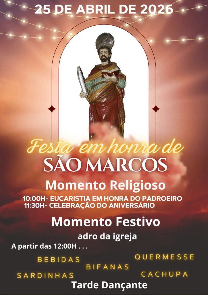 A Paróquia de São Marcos, na União das Freguesias do Cacém e São Marcos, assinala este sábado, dia 25 de abril, a comemoração de aniversário, com a tradicional festa em honra do Santo Padroeiro, num programa que conjuga momentos religiosos e atividades festivas abertas ao público.